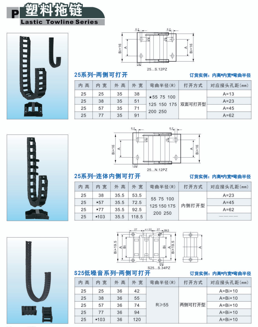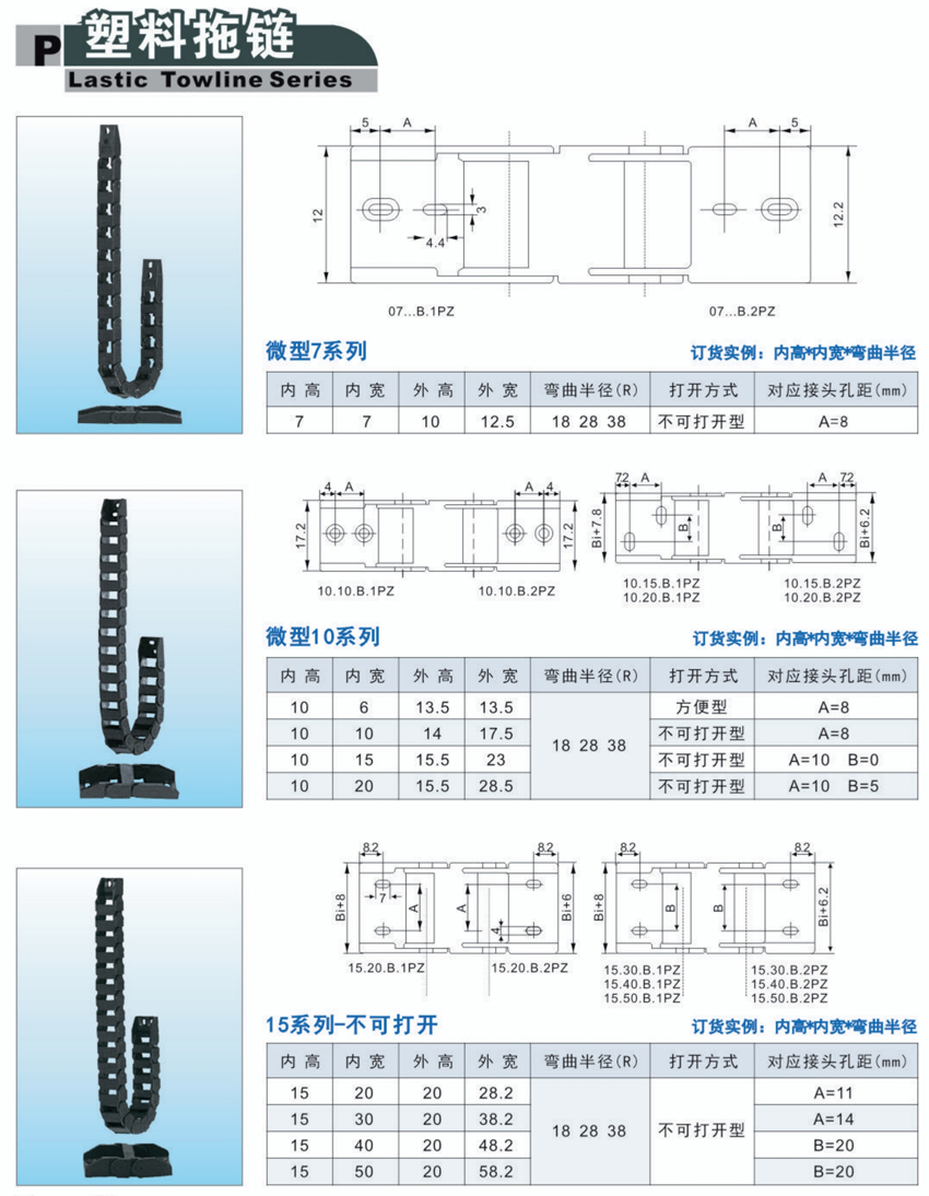 拖鏈外形似坦克鏈,由眾多單元鏈節(jié)組成,鏈節(jié)之間轉(zhuǎn)動自如。相同系列的拖鏈內(nèi)高、外高、節(jié)距相同,拖鏈內(nèi)高、彎曲半徑R可有不同的選擇。單元鏈節(jié)由左右鏈板和上下蓋板組成,拖鏈每節(jié)都能打開,裝拆方便,不必穿線,打開蓋板后即可把電纜、油管、氣管等放入拖鏈內(nèi)。